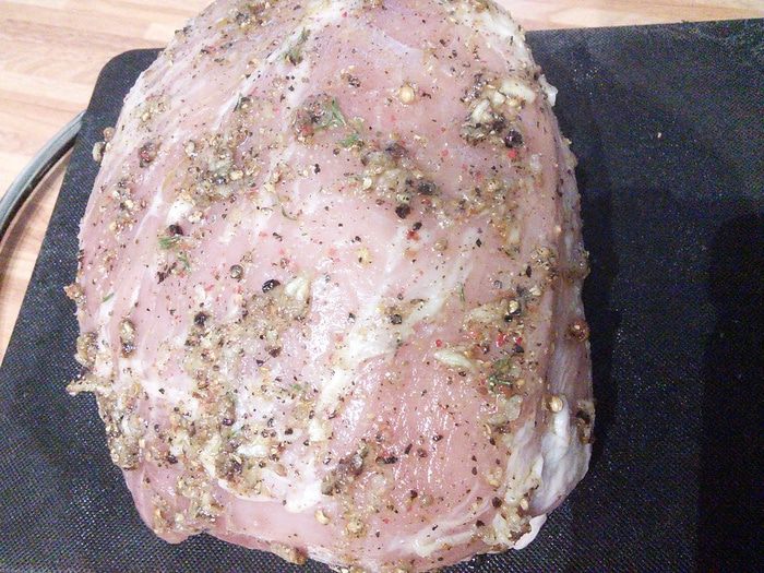 Окорок обмыть, осушить, удалить лишний жир и жилки и натереть полученной смесью со всех сторон. Время маринования 3 часа.