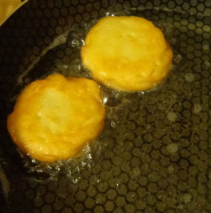 Раскалить в сковороде растительное масло и опускать в него тесто прямо на пергаменте. Через минуту бумага отклеится и ее можно будет вынуть. А тесто жарить на среднем огне до золотистости, пару раз перевернув печенья.