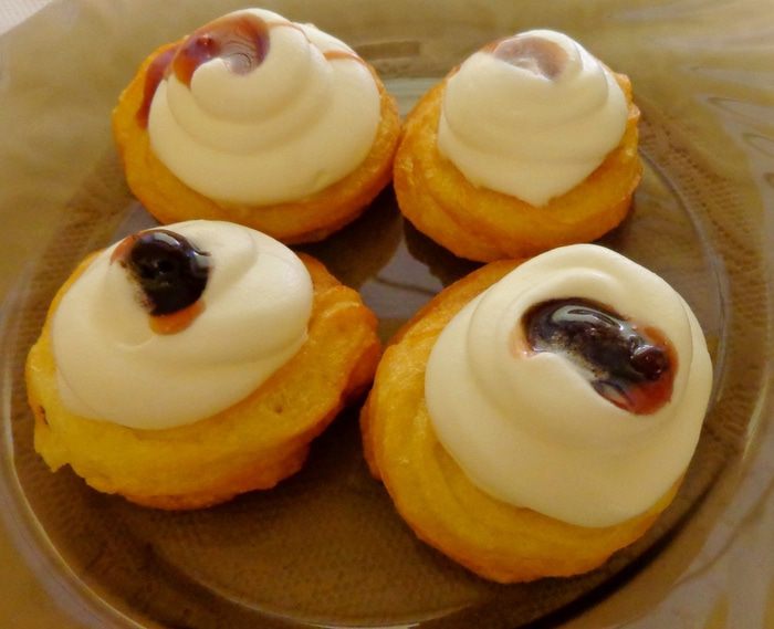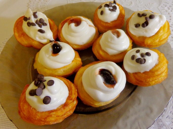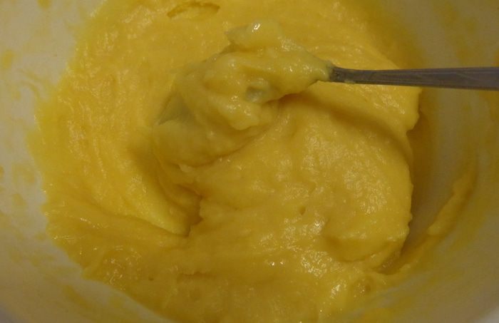Сделать заварное тесто: в кипящей воде с солью и сахаром растворить масло. Когда масло растопится, добавить муку и размешать до однородности. По одному добавить яйца. Получится кремообразное тесто.
