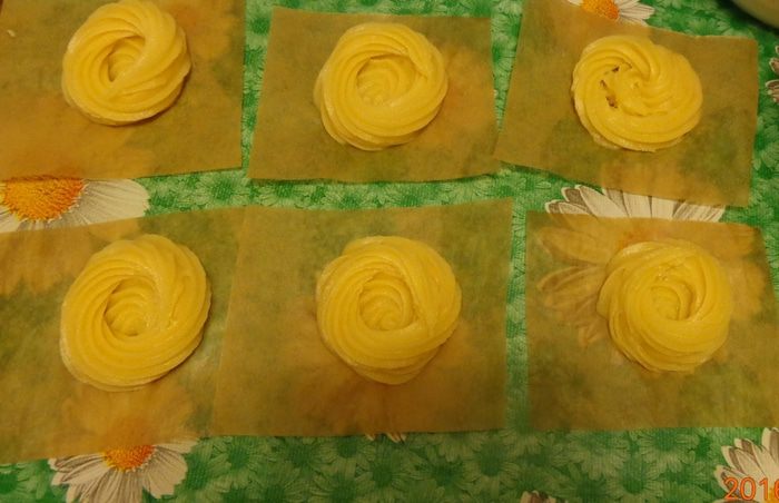 Переложить тесто в кулинарный мешок с насадкой звездочка. Пергамент для выпечки нарезать на 9 квадратиков и отсадить на них тесто в виде гнездышек.