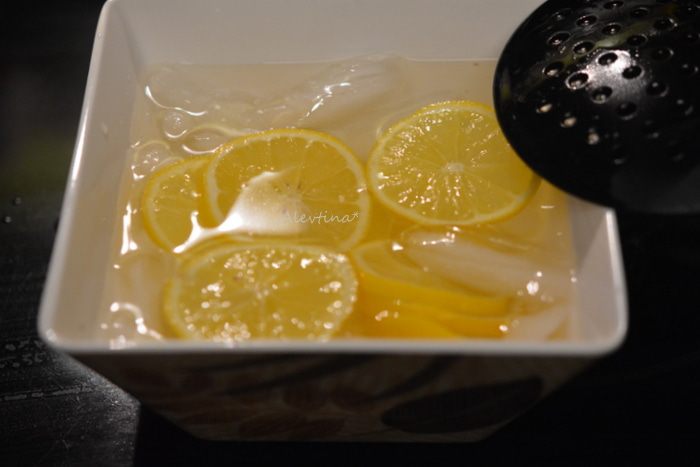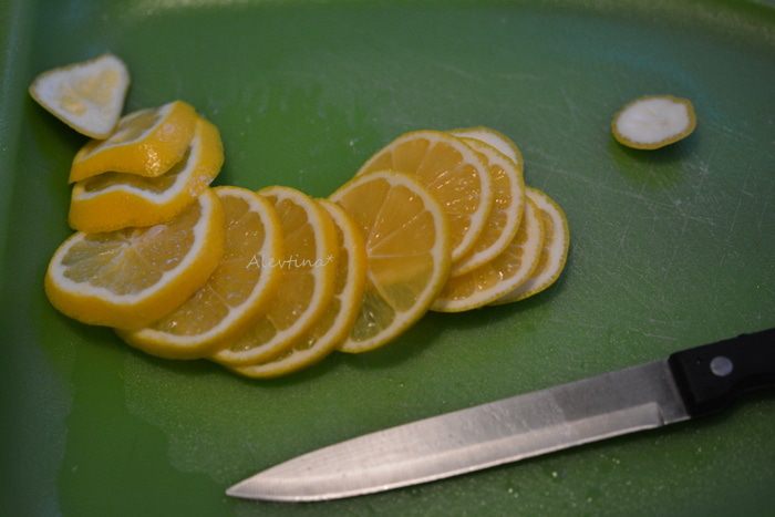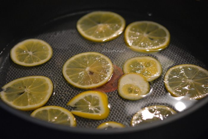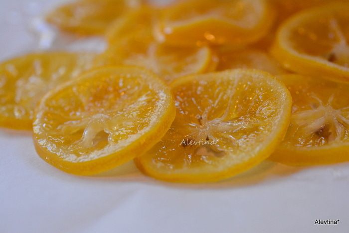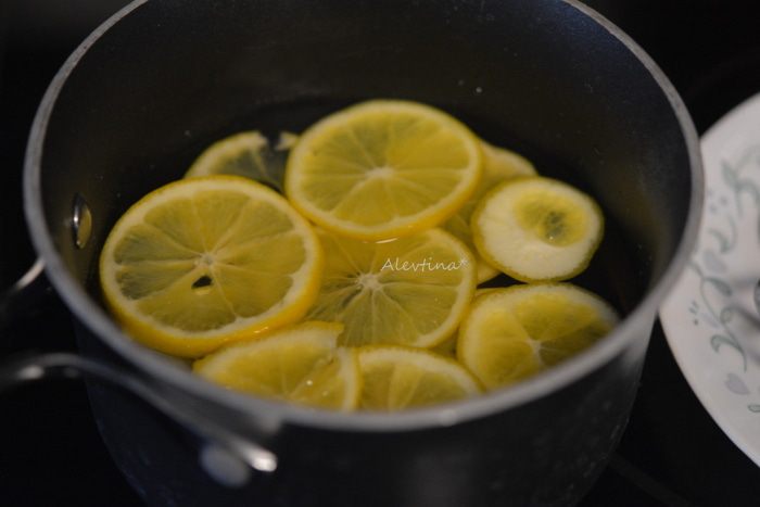 В небольшую кастрюлю вылить 1 стакан воды, добавить сахар и поставить на огонь. Помешивать до растворения сахара. Как пойдут пузырьки, огонь убавить и добавить лимонные кружки. Варить на медленном огне 1 час, не допускать закипания. Убавляйте огонь, как начнет закипать и помешивайте аккуратно.