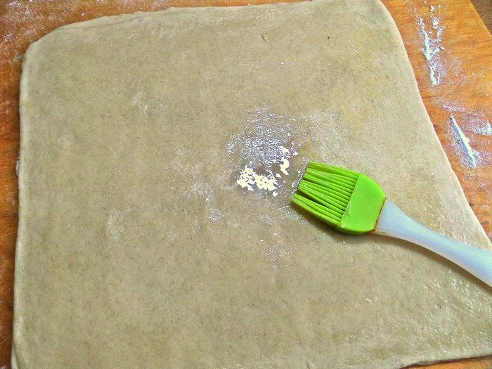 Тесто раскатать тонко в квадрат. Смазать 1 ст. л. растительным масло без запаха.