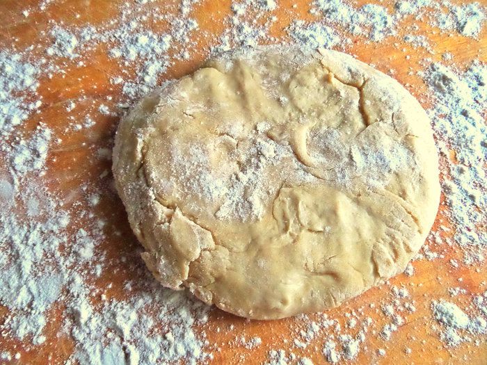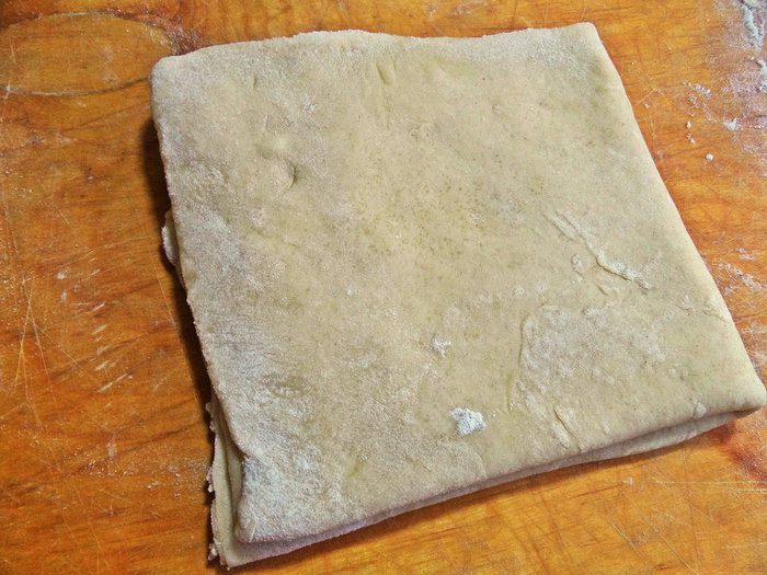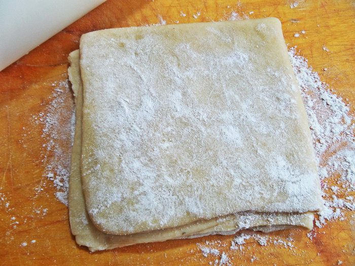 Складываем опять вчетверо, не забываем присыпать муку на доску.