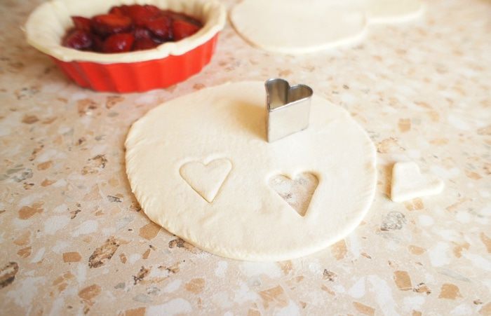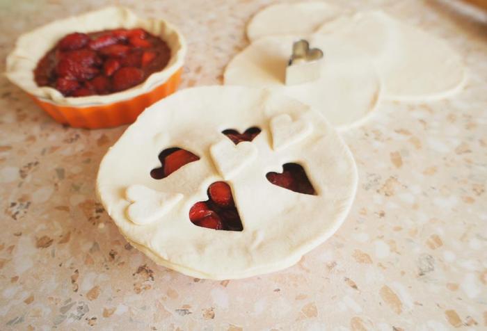 Раскатать второй лист теста такой же толщиной, что и первый и сделать из него "крышечки" для пирога.