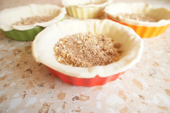 Посыпать тесто молотым миндалем, благодаря которому, лишняя жидкость, образованная из начинки, впитается в орехи и не размочит нашу основу из теста.