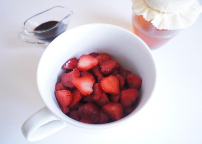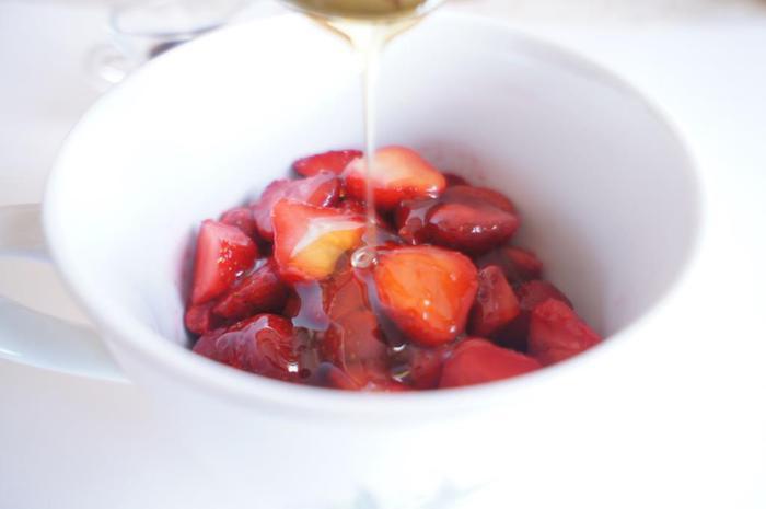 К ягодам добавить мед и бальзамический уксус. Слега перемешать, чтобы ягодки не подавились и поставить в холодильник на несколько часов.