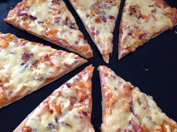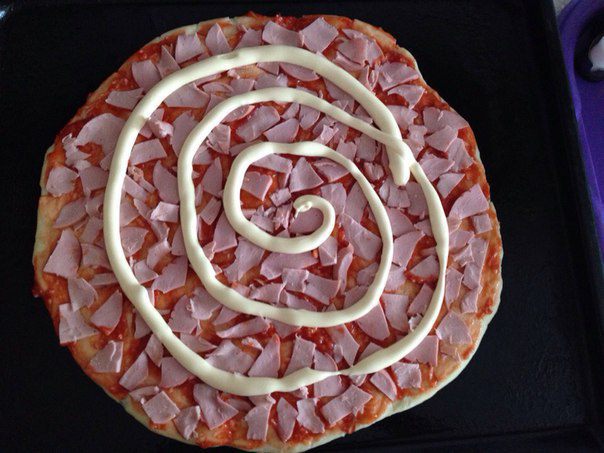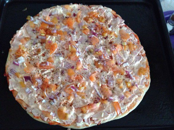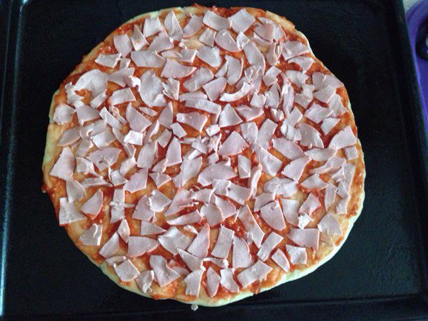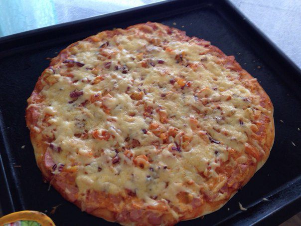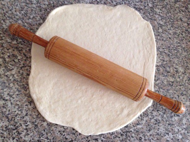 Раскатываем тесто (я люблю делать круглую форму). Чтобы тесто не прилипало к рабочей поверхности то лучше присыпать ее немного мукой (лишнее потом стряхнуть). Выложить на противень, накрыть кухонным полотенцем и дать настояться минут 15-30. Затем еще раз распределить его по противню (тесто немного могло приподняться пока настаивалось, поэтому для тех, кто любит тонкое тесто то его надо подраскатать еще немного. Включаем духовку на 180-200°С.