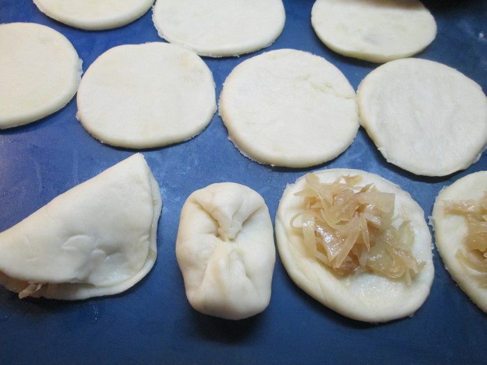 Формирую пирожки так: раскатываю круг любого диаметра, на одну половинку кладу начинку, сверху накрываю второй половиной круга, защипываю. Концы (уголки) подворачиваю внутрь и тоже защипываю.