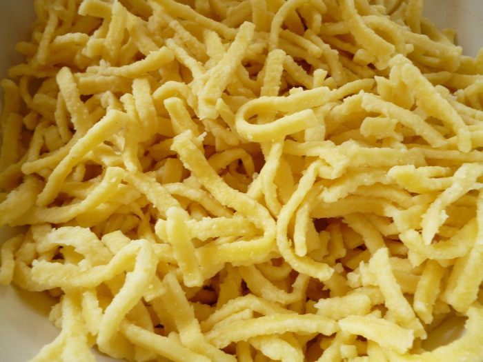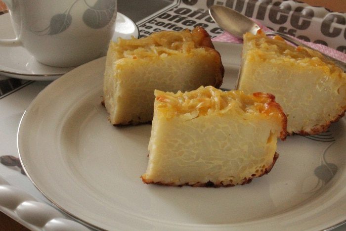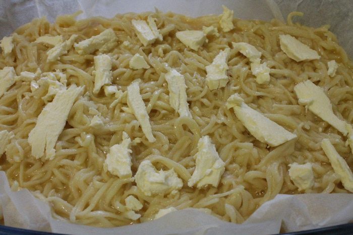 Форму для запекания выстелить пергаментом, смазать сливочным маслом и посыпать молотыми сухарями. Равномерно распределить лапшу и залить яичной смесью. Сверху распределить кусочки сливочного масла. Форму накрыть крышкой или фольгой. Запекать при 180°C 20 минут, затем крышку снять и запекать еще 20 минут, чтобы верх немного подрумянился.. Если у вас стеклянная форма для запекания, крышку можно не снимать.