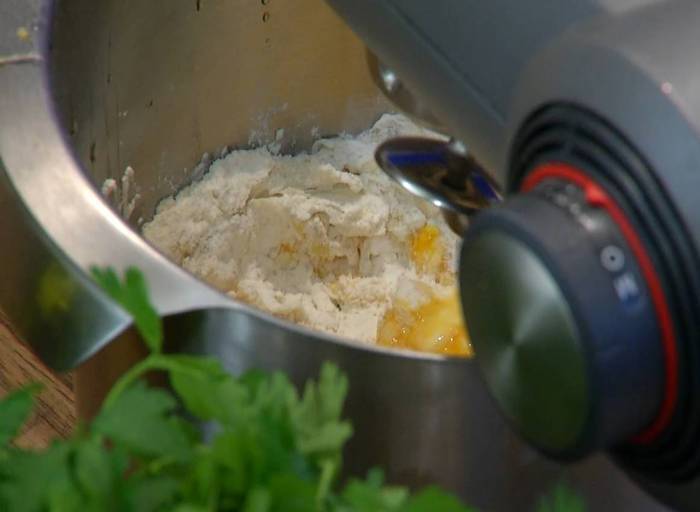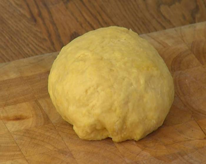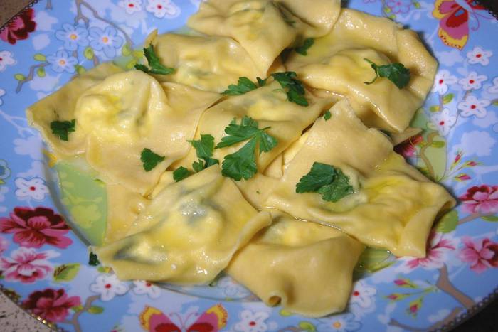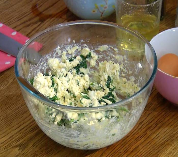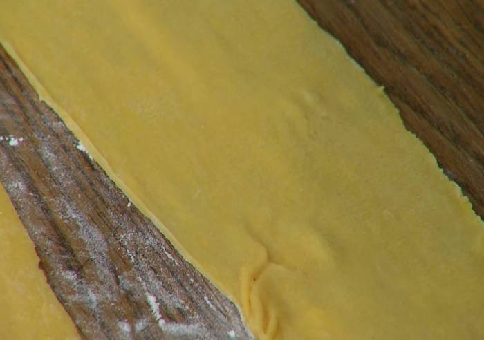 На одну половину теста поместить начинку, выкладывая по одной чайной ложке на некотором расстоянии друг от друга, смазать тесто вокруг начинки белком, накрыть второй половиной теста, скрепить края и ножом разрезать тесто на квадратики с начинкой посередине.