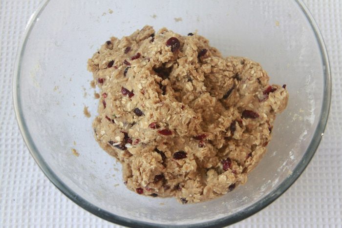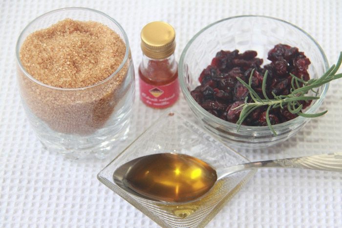 Добавить 1 стакан коричневого сахара (у автора 1+1/4 стакана, но мне показалось слишком сладко), 1 ч. л. ванильного экстракта, 1 ст. л. мёда, 3/4 стакана вяленой клюквы (это 100 г) и 1/2 ч. л. мелко нарезанного свежего розмарина.