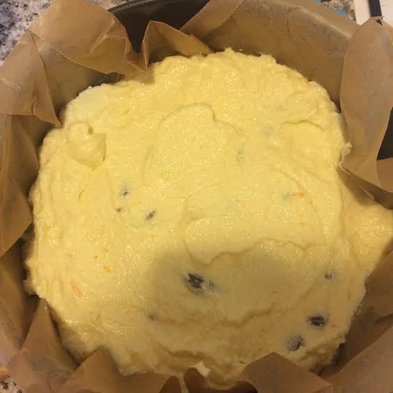 Разъемную форму диаметром 20 см выстлать бумагой для выпечки и выложить тесто.