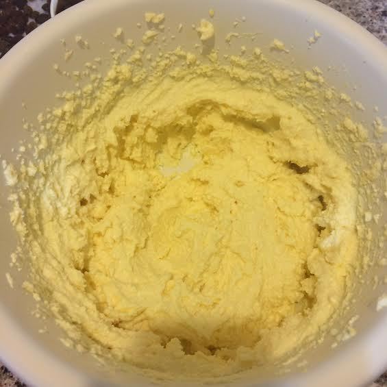 К творогу добавляем масло комнатной температуры, кукурузный крахмал, желтковую массу, ваниль и перемешиваем миксером на средней скорости.