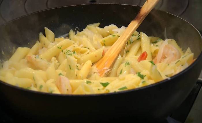 В кастрюлю с макаронами влить тыквенный соус, перемешать, затем переложить пасту в сковороду с креветками, еще раз все перемешать и немного прогреть на сильном огне.