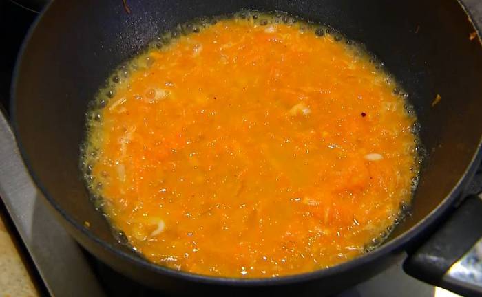 Влить овощной бульон, перемешать и прогревать все несколько минут.