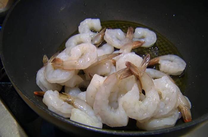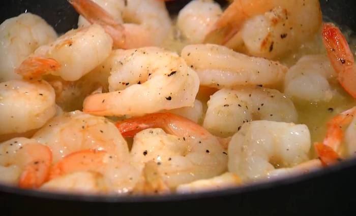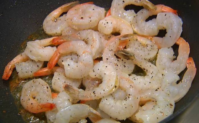Разогреть в сковороде оставшееся оливковое масло, выложить креветки, посолить, посыпать черным перцем и обжарить.