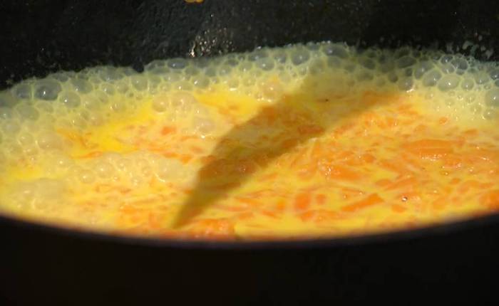 Когда тыква будет готова, влить в сковороду 50 мл молока, перемешать и еще немного все прогреть.