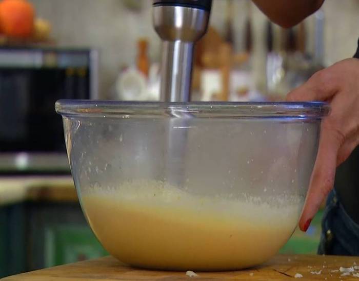 Измельчить тыкву погружным блендером. Не прекращая взбивать, влить оставшееся молоко и взбить все в однородное пюре.