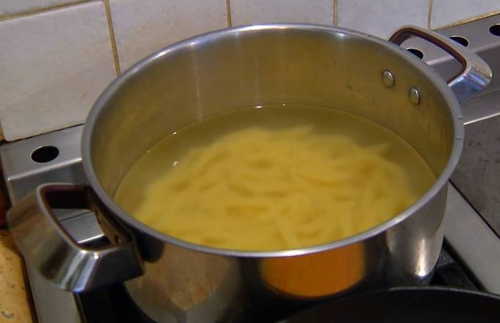 Пенне отваривать в подсоленной воде на минуту меньше, чем указано в инструкции на упаковке, затем воду слить и вернуть макароны в кастрюлю.