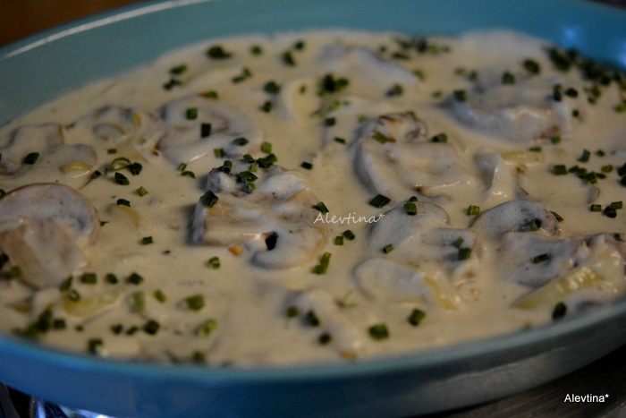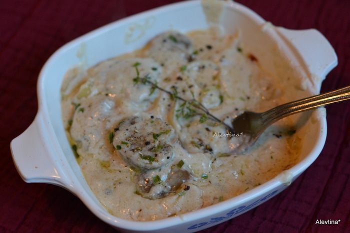 Добавить сливочное масло, дать растопиться, затем муку, мускатный орех. тимьян 1 /2 ч.л. Влить вино, добавить сметану, сливки и протертый сыр, как пармезан и грюйер. Посолить и поперчить.