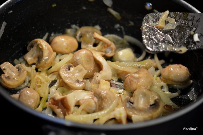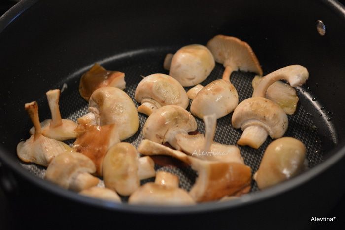 Разогреть 2 ст.л. масла. Выложить грибы очищенные и нарезанные. Готовить примерно 5 минут, если белые или 3 минуты шампиньоны. Посолить и поперчить.