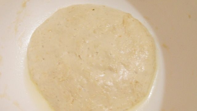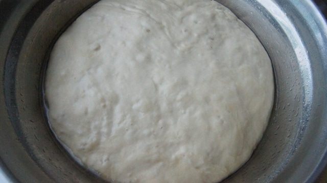Начинаем приготовление хлеба с вечера. Ставим опару: cмешать муку, дрожжи и воду. Получается туговатое тесто. Миску смазать маслом растительным, покатать тесто по миске, закрыть пленкой и оставить на ночь (8-10 часов),при комнатной температуре.
