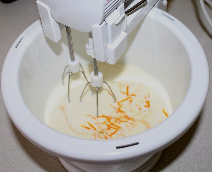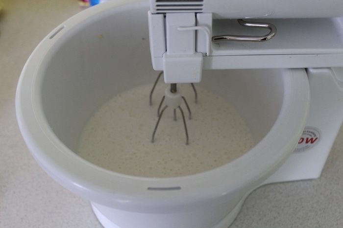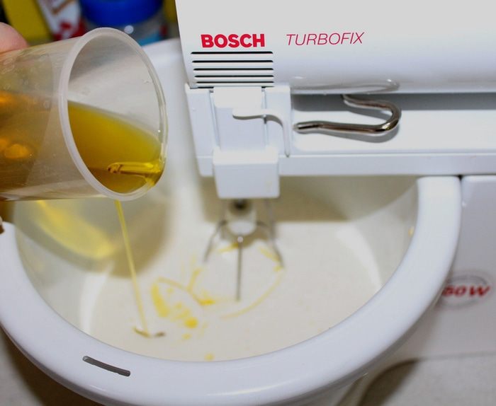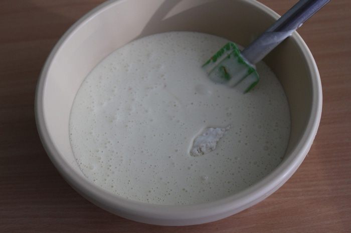Просеять муку с разрыхлителем и содой, интенсивно перемешать.