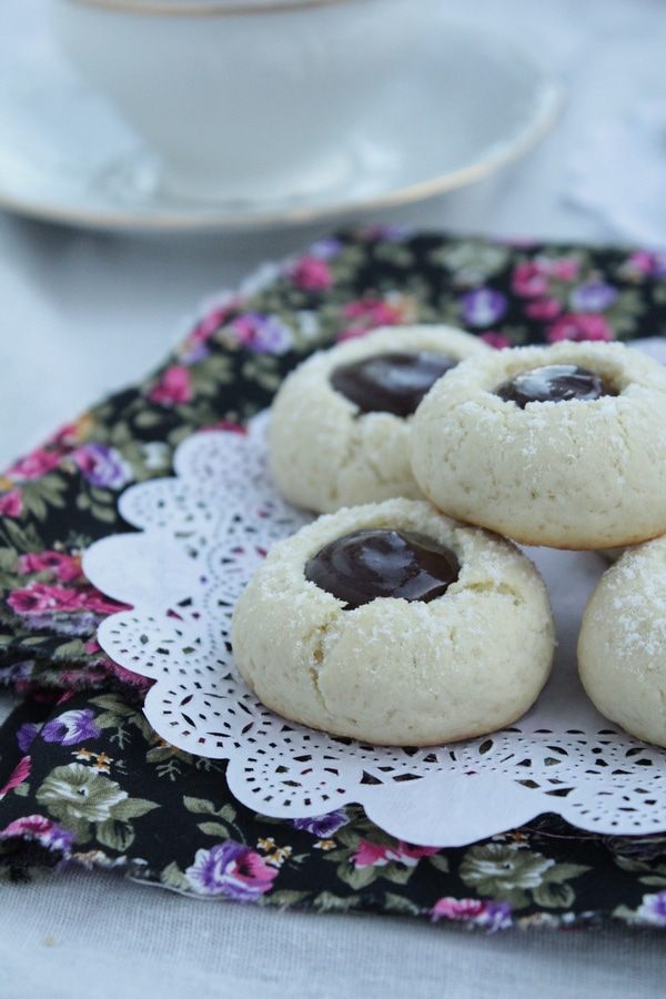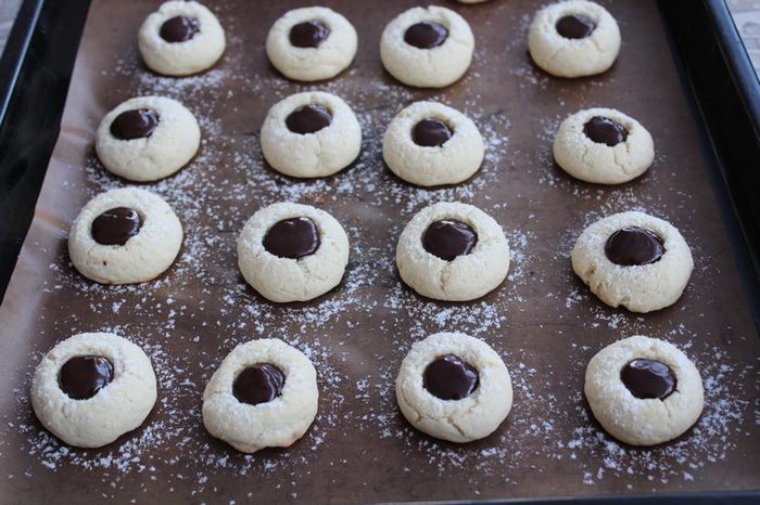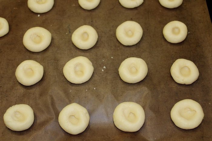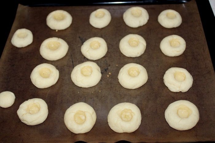 Скатать шарики с грецкий орех, выложить на противень, сделать углубления. Выпекать в разогретой духовке 180°C 5-6 минут.