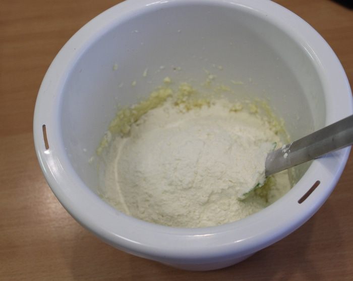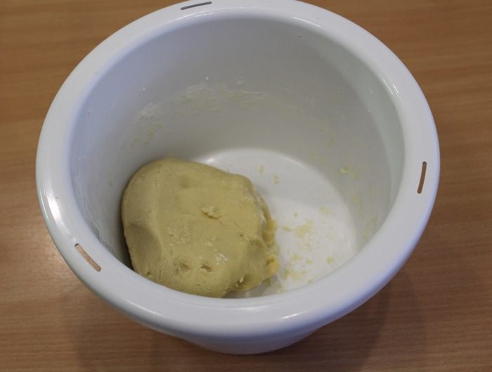 Собрать тесто в комок. Долго не месить. Тесто поставить на 15 минут в холодильник.