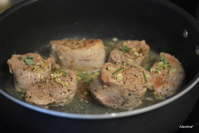 Свиную вырезку порезать на медальоны, если режете тонко, то и готовка сократится по времени. Посолить и поперчить со всех сторон медальоны свинины.