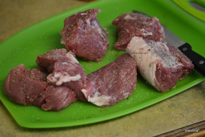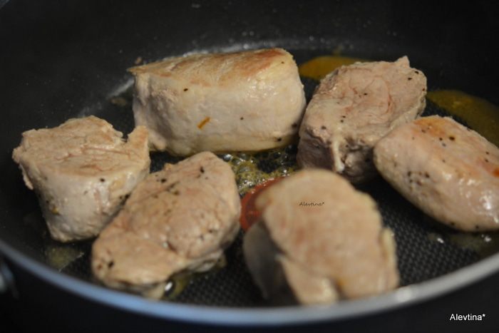 Разогреть сковороду, вылить масло. Обжарить свинину с 2-ух сторон. Примерно 1-2 минуты сторона.