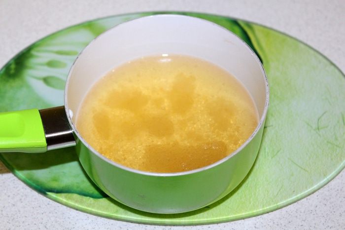 Желатин залить холодной водой и оставить на 5-8 минут набухать. Слегка подогреть яблочный сок, не доводя до кипения. Ввести желатин в яблочный сок и мешать до полного растворения. Оставить почти до остывания.