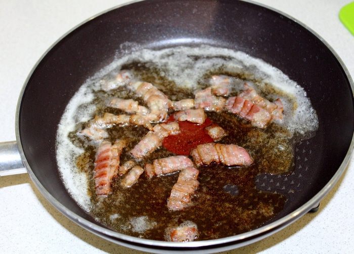 Лук порезать полукольцами, добавить к бекону, добавить сахар и немного соли. Тушить все вместе до мягкости лука.