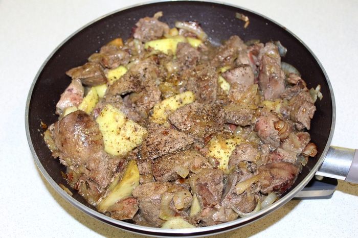 Добавить нарезанную на кусочки печень и тушить до полуготовности. Затем добавить очищенное и порезанное яблоко, влить коньяк, специи и томить до мягкости яблока и готовности печени. Снять с огня.