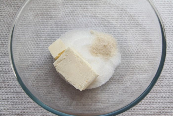 Отмерить 100 г сахарного песка, 10 г ванильного сахара и 100 г размягчённого сливочного масла.
