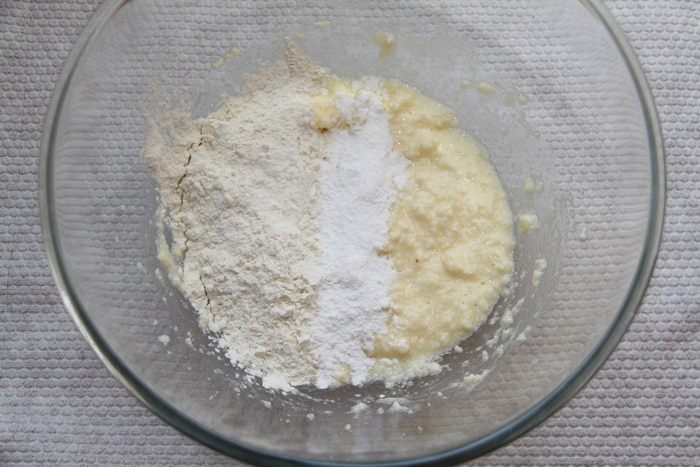 В смесь просеять пшеничную муку и разрыхлитель. Перемешать.
