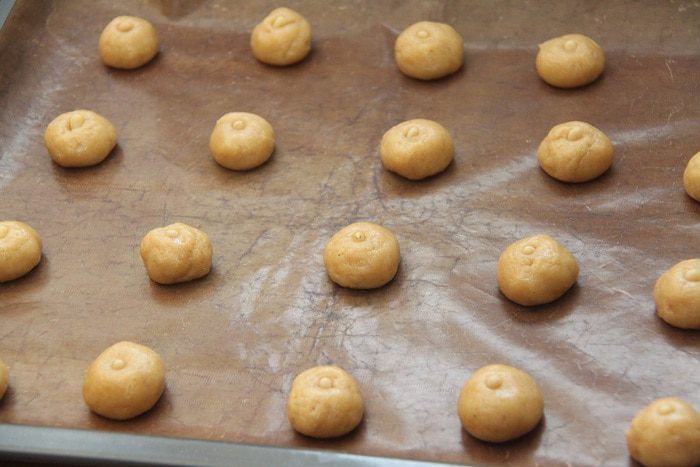 Сформировать из теста шарики размером с грецкий орех. В центр каждого шарика вдавить кедровое семечко.