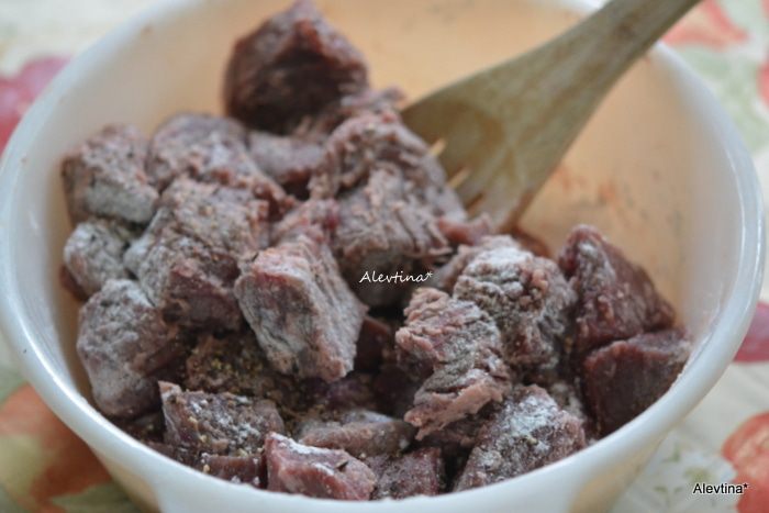 Говядину кубиками обвалять в муке с солью и черным перцем.