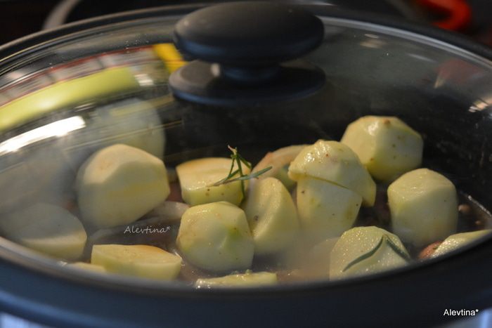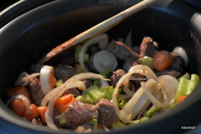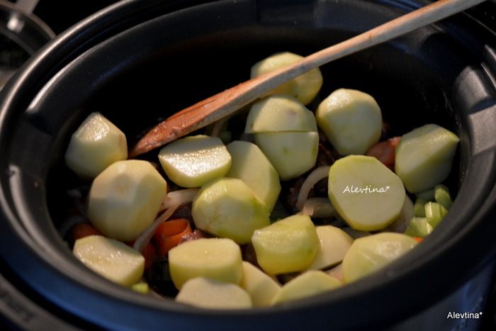 Обжарить на оливковом масле чеснок примерно 1 минуту. Добавить затем мясо с мукой и обжаривать до коричневого цвета со всех сторон. Переложить все в медленноварку с овощами нарезанными.