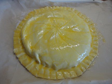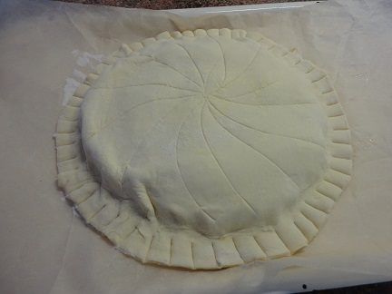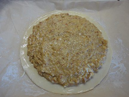 1 лист теста (или половину, если оно у вас цельным куском) раскатать так, чтобы можно было вырезать круг диаметром 25 см. Я сразу выкладываю круг на лист для выпечки, выстланный пекарской бумагой. Этот лист и оставшееся тесто пока поместите в холодильник (у меня для этого идеальная температура на лоджии -1)