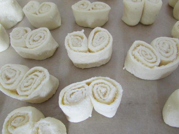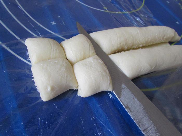 Разрезать двойной рулет на кусочки, толщиной 1–1,5 см. Так проделать с каждой частью теста.
