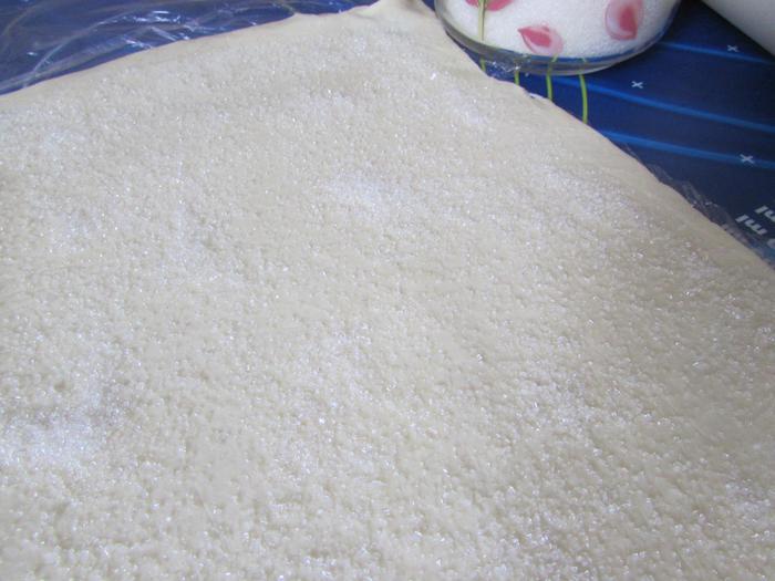 Раскатать тесто (1 часть) в тонкий пласт (я это делаю в целлофановом пакете, затем по бокам разрезаю и тесто очень тонкое, не прилипло).
