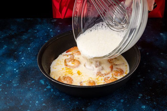 Вылейте взбитую молочно-яичную смесь к креветкам и интенсивно их перемешивайте в течение 2 минут, пока омлет не загустеет.