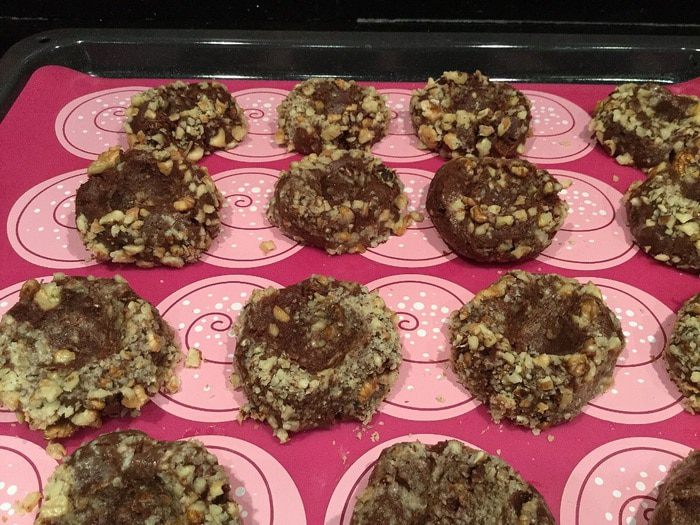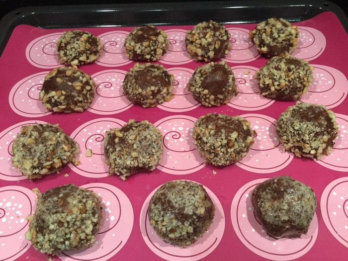 Из теста сформируйте небольшие шарики, обмакните их в белок и обваляйте в орехах. Выложите на застеленный пергаментом или силиконовым ковриком противень.
