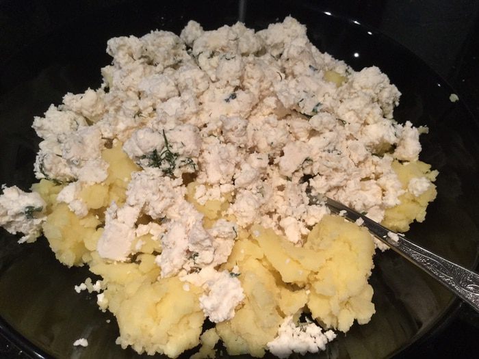 Приготовьте начинку: смешайте картофельном пюре и сыр.