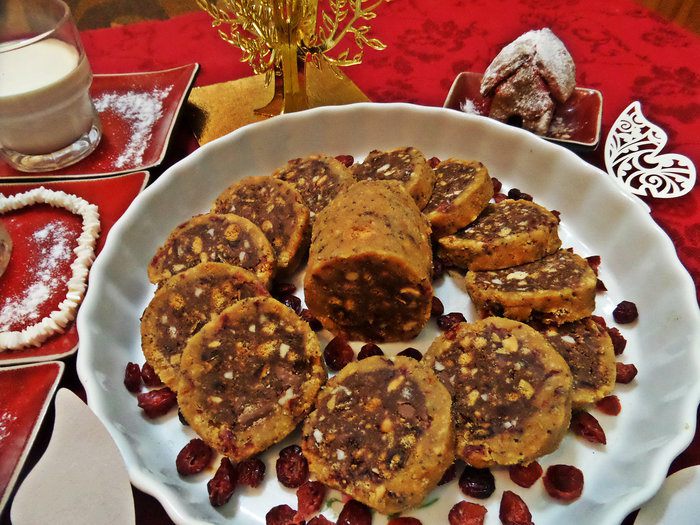 Помещаем "тёмную колбасу" на светлый слой печенья.