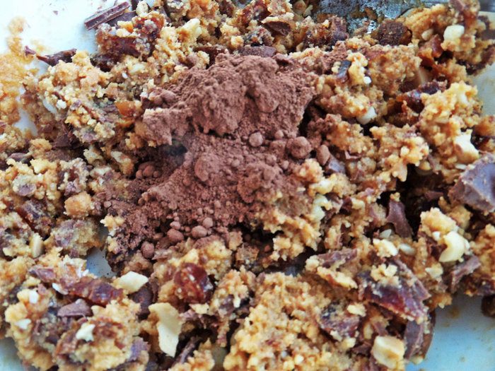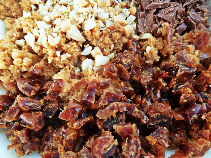 Измельчаем финики в общую массу. Перемешиваем и делим массу пополам!
