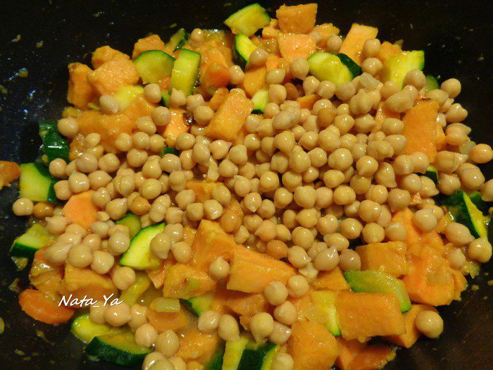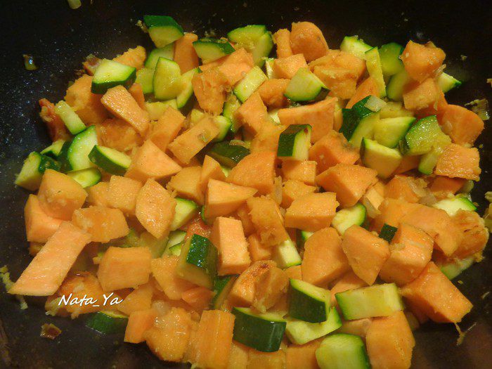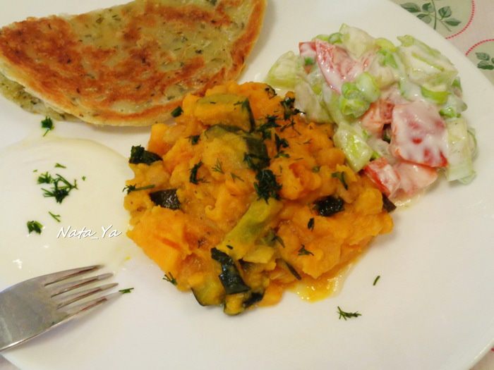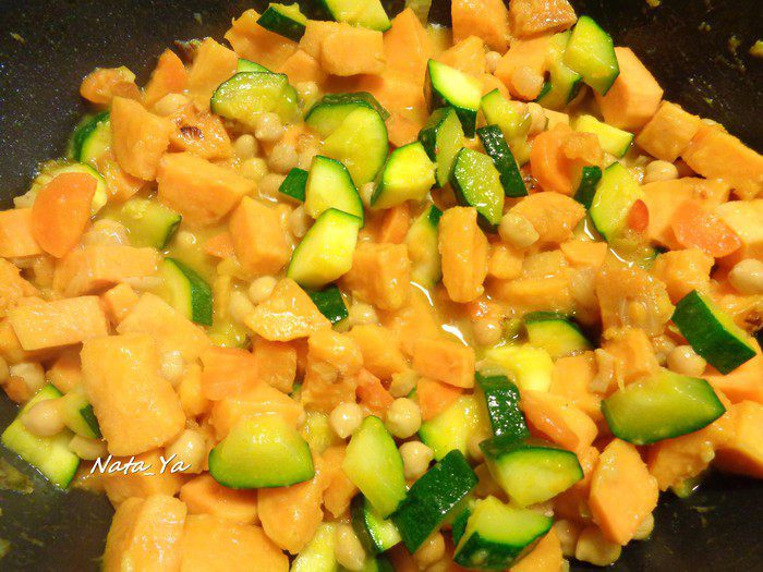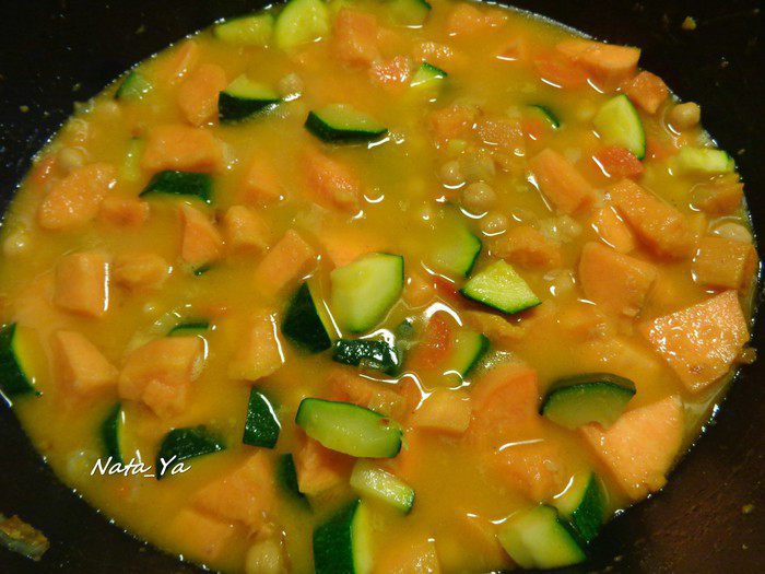 Сладость батата компенсируем чили, чесноком и имбирем. Горох нут придаст нужную консистенцию нашему карри. А лепешки и йогурт подчеркнут индийскую нотку и гармонично впишутся в это блюдо.