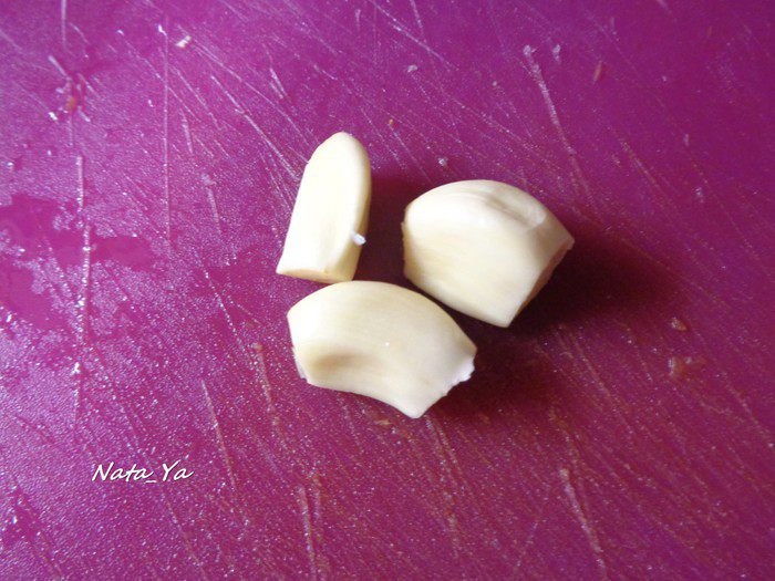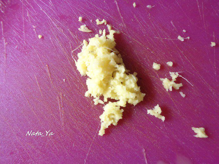 Чеснок очистим и пропустим через пресс для чеснока прямо к овощам.