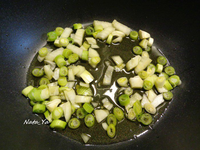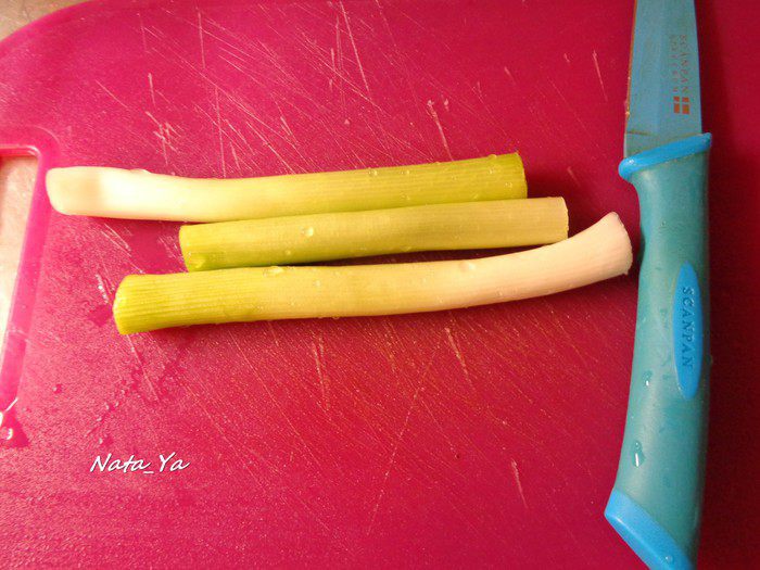 Нам понадобится белая часть стеблей зеленого лука. Зеленую часть оставьте для овощного салата.